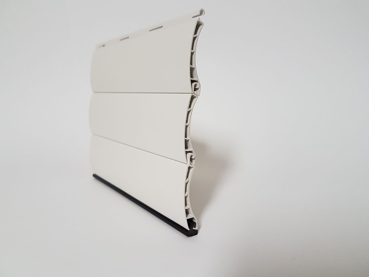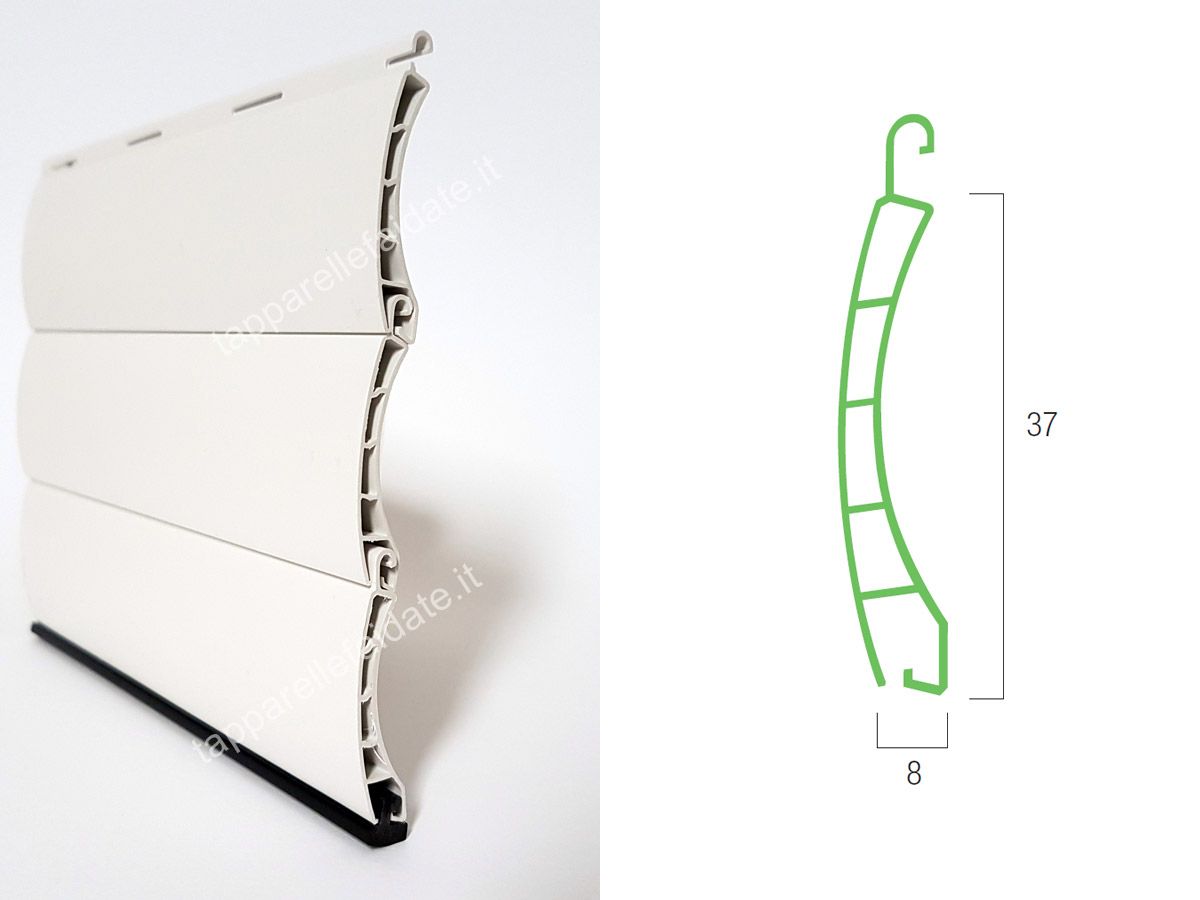 La tapparella in PVC Mignon (peso specifico standard di circa kg. 3,200/mq) è realizzato con stecche auto-aggancianti (a doppia parete e con intersezioni di irrigidimento interno) che misurano 8 mm di base e 37 mm di altezza.
