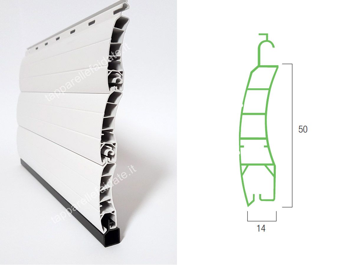 La tapparella in PVC Super (peso specifico standard di circa kg. 4,800/mq) è realizzata con stecche auto-aggancianti (a doppia parete e con intersezioni di irrigidimento interni) che misurano 14 mm di base e 50 mm di altezza. Il profilo è dotato di un fermo laterale "antisfilamento" che serve a bloccare le stecche.