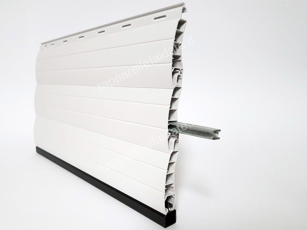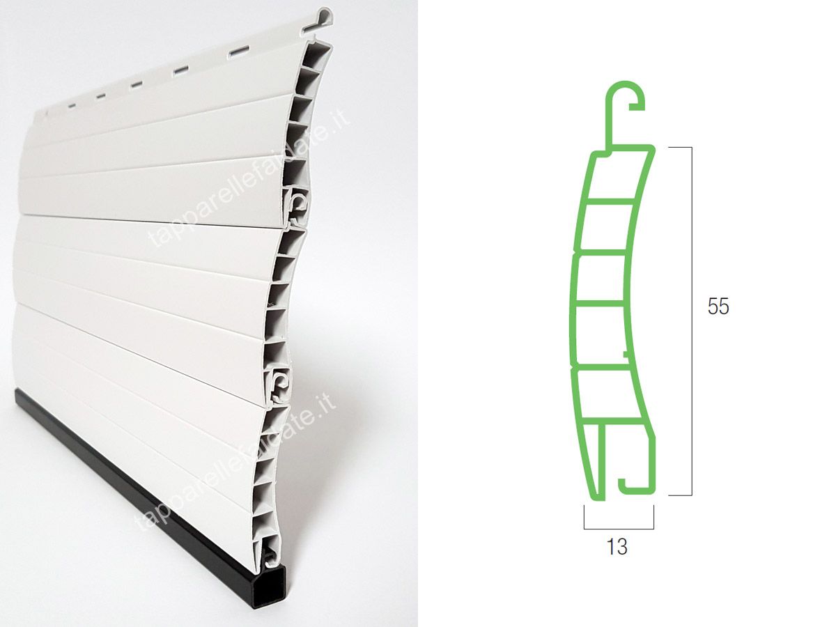 La tapparella in PVC Genoa (peso specifico standard di circa kg. 5,000/mq) è realizzata con stecche auto-aggancianti (a doppia parete e con intersezioni di irrigidimento interni) che misurano 13 mm di base e 55 mm di altezza.