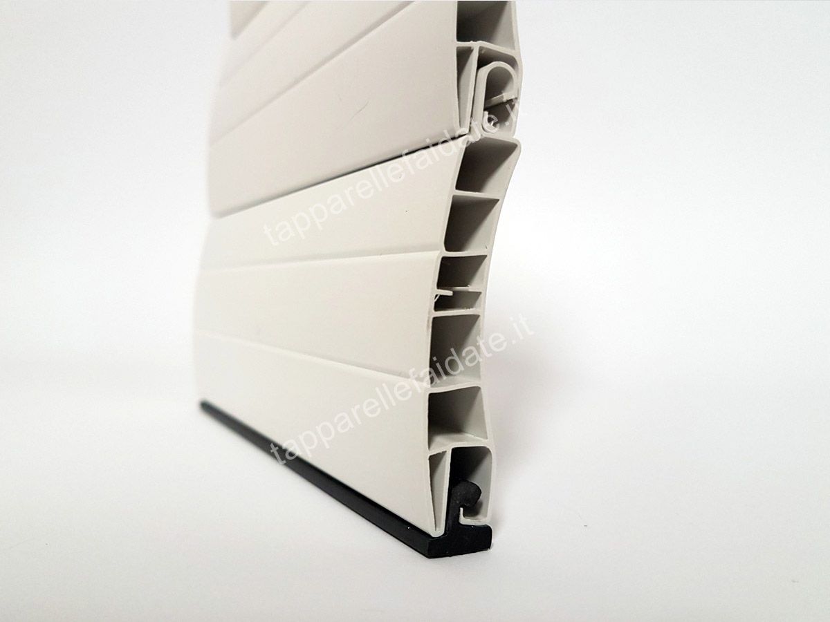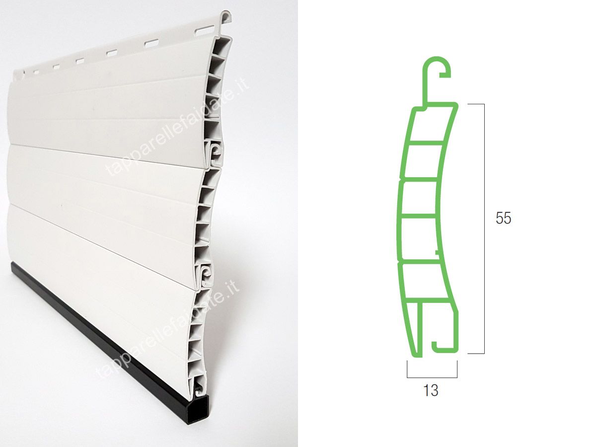 La tapparella in PVC Roma (peso specifico standard di circa kg. 6,000/mq) è realizzata con stecche auto-aggancianti (a doppia parete e con intersezioni di irrigidimento interni) che misurano 13 mm di base e 55 mm di altezza.