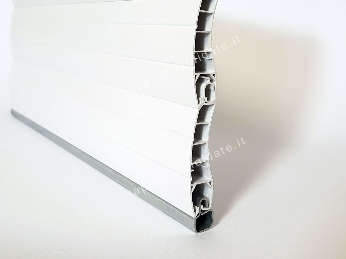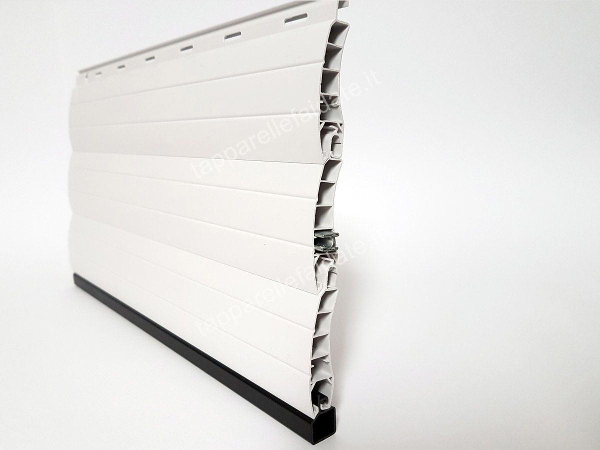 La tapparella in PVC Roma (peso specifico standard di circa kg. 6,000/mq) è realizzata con stecche auto-aggancianti (a doppia parete e con intersezioni di irrigidimento interni) che misurano 13 mm di base e 55 mm di altezza. Il profilo è dotato di un fermo laterale "antisfilamento" che serve a bloccare le stecche.