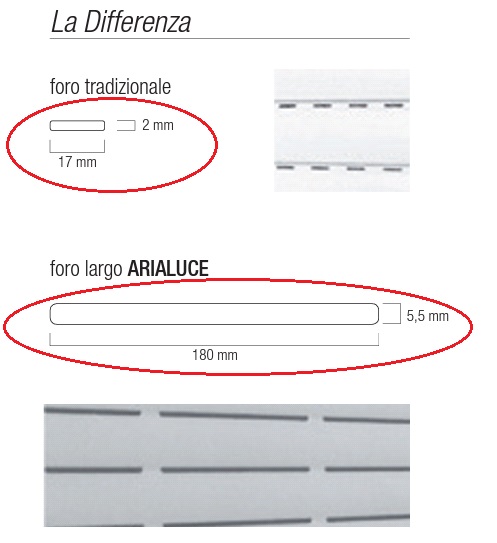 La dimensione del foro (altezza 5,5 mm, larghezza 180 mm), nettamente superiore a quello tradizionale (altezza 2 mm, larghezza 17 mm) favorisce, a tapparella abbassata, l’agevole riciclo dell’aria all’interno dell’abitazione e, nel contempo, l’entrata della luce solare.